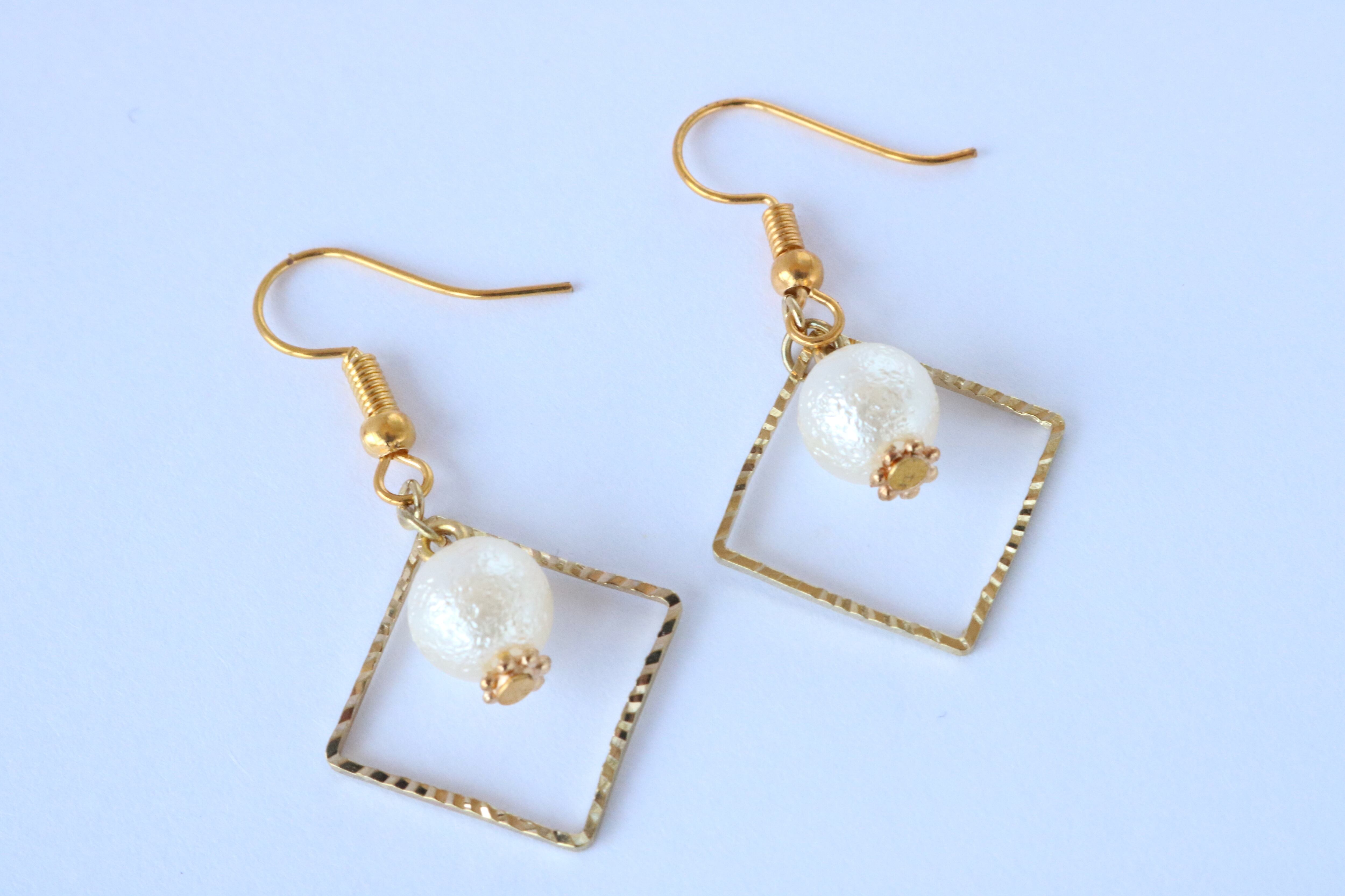 四角のキラキラしたスクエア空枠に、コットンパールビーズを加えた大人可愛いゴールドピアスです。♪:*°