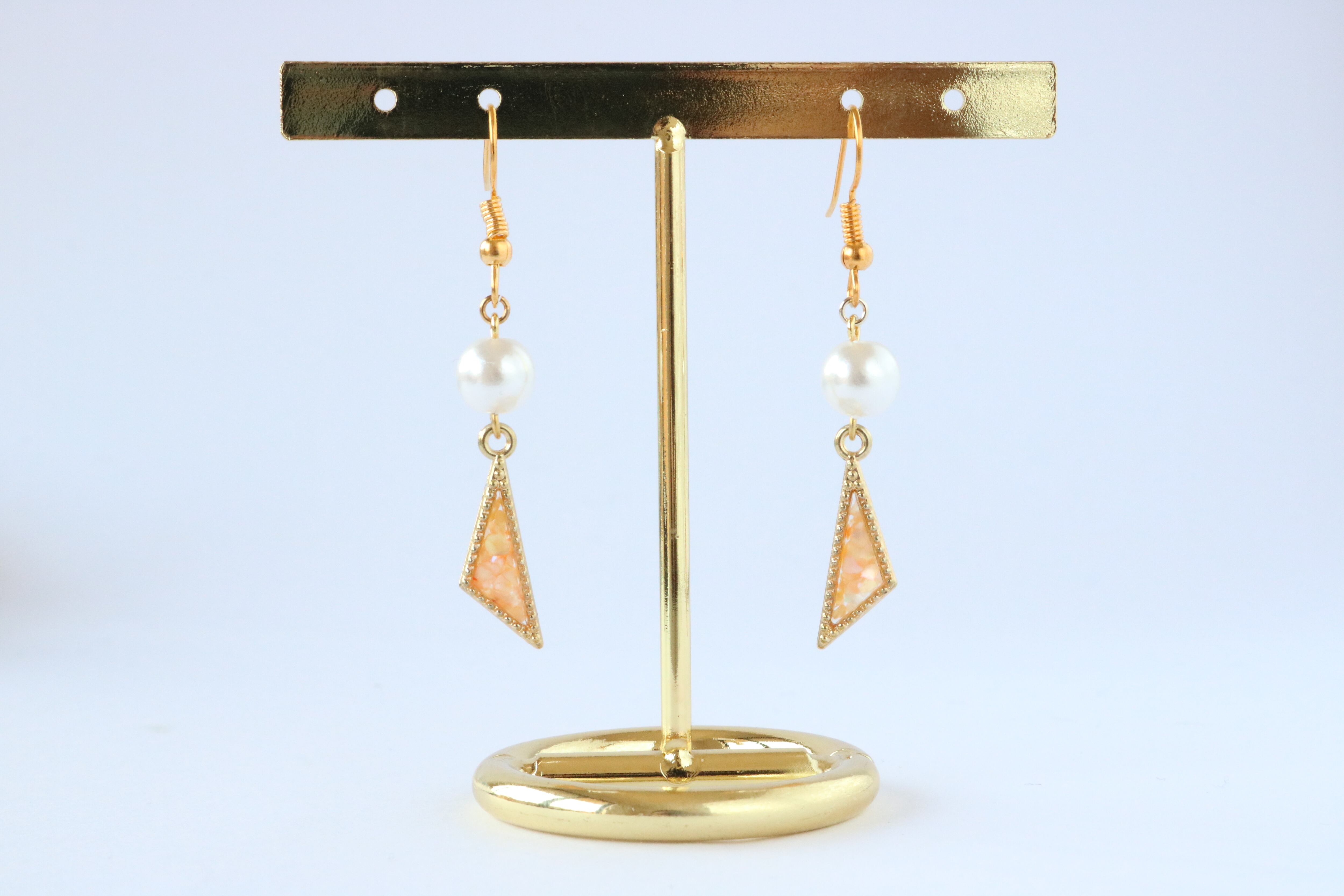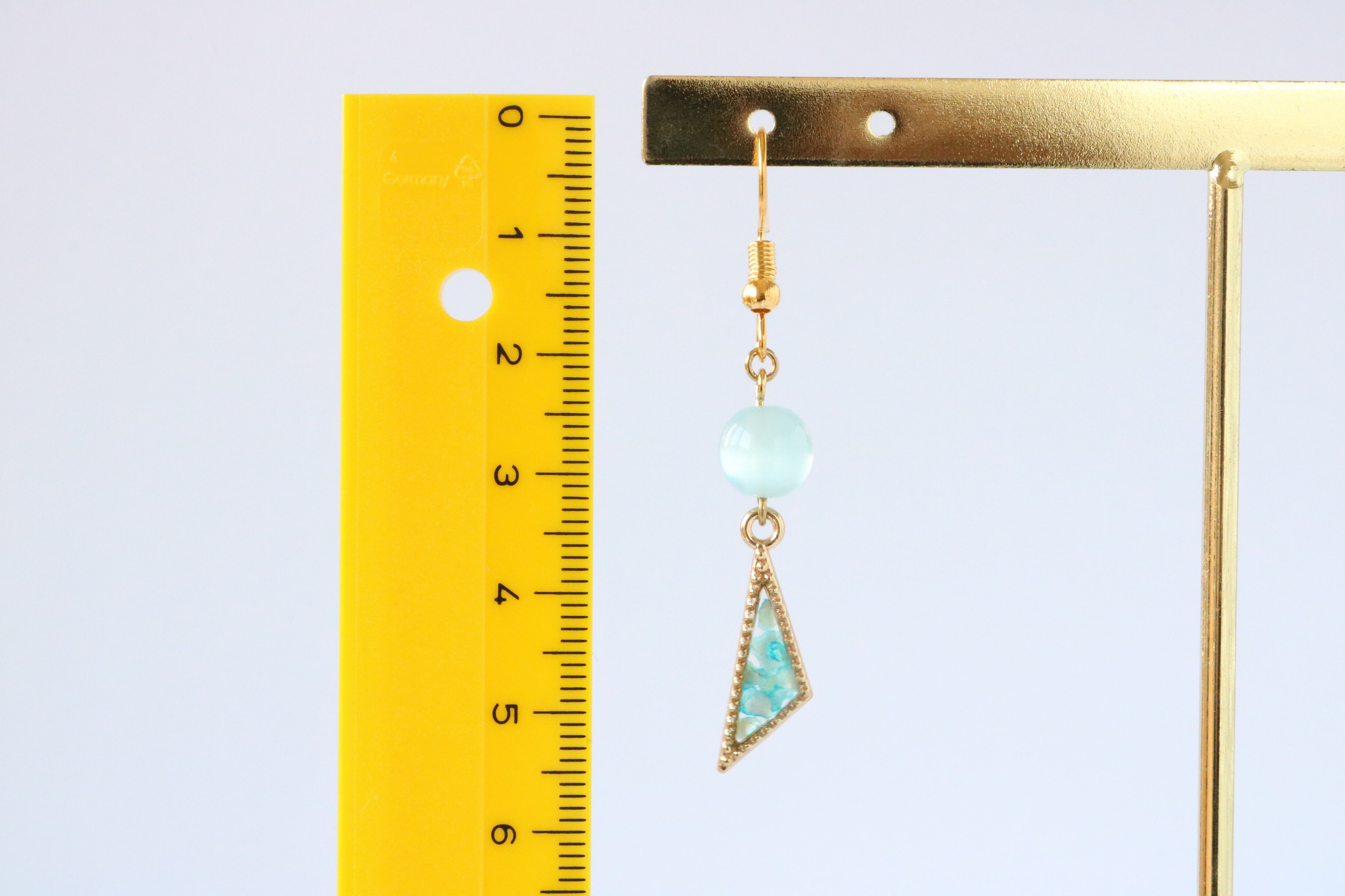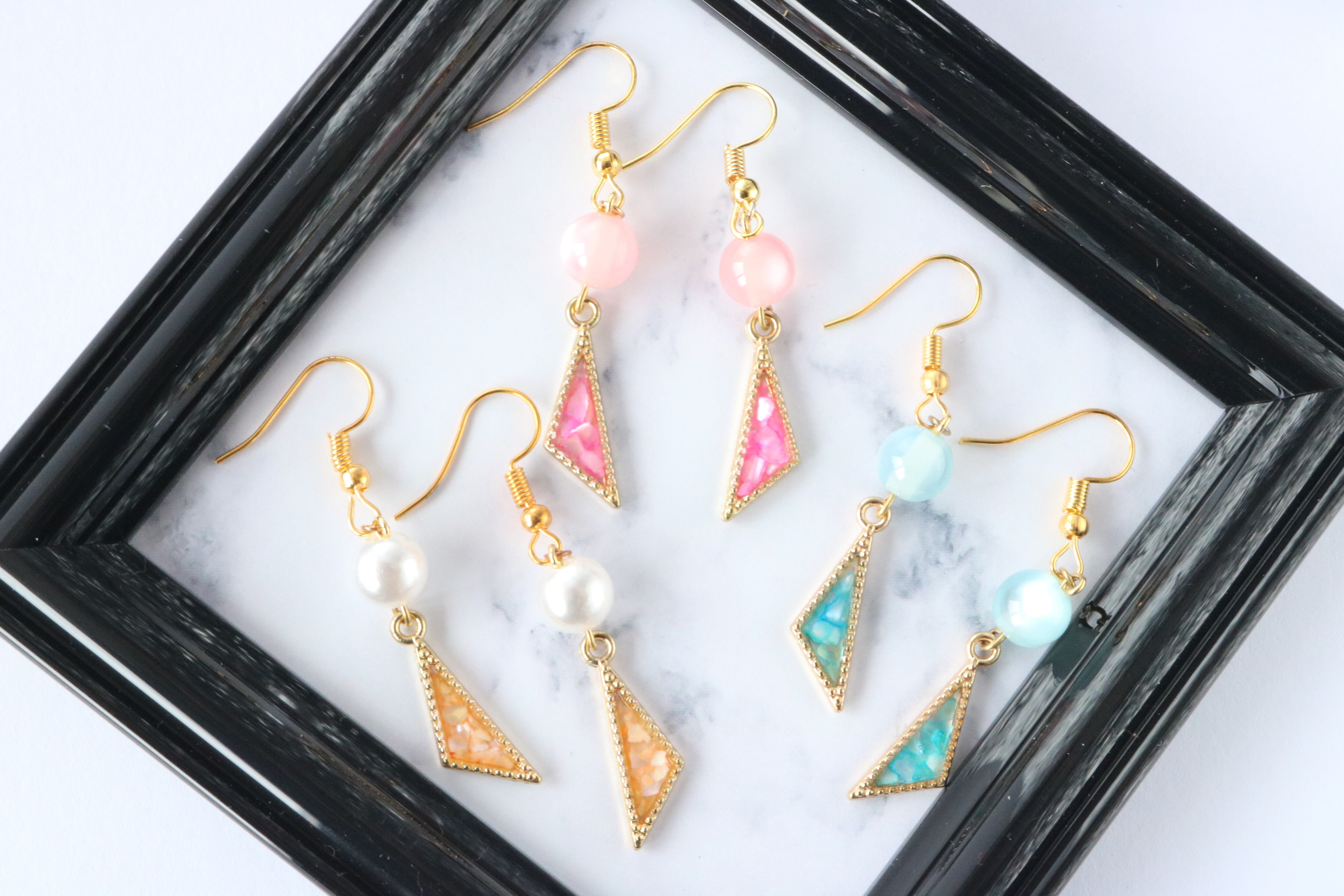 レジンを使用した三角枠チャームに、ビーズやパールがアクセントになった上品でエレガントなゴールドピアスです。♪:*°