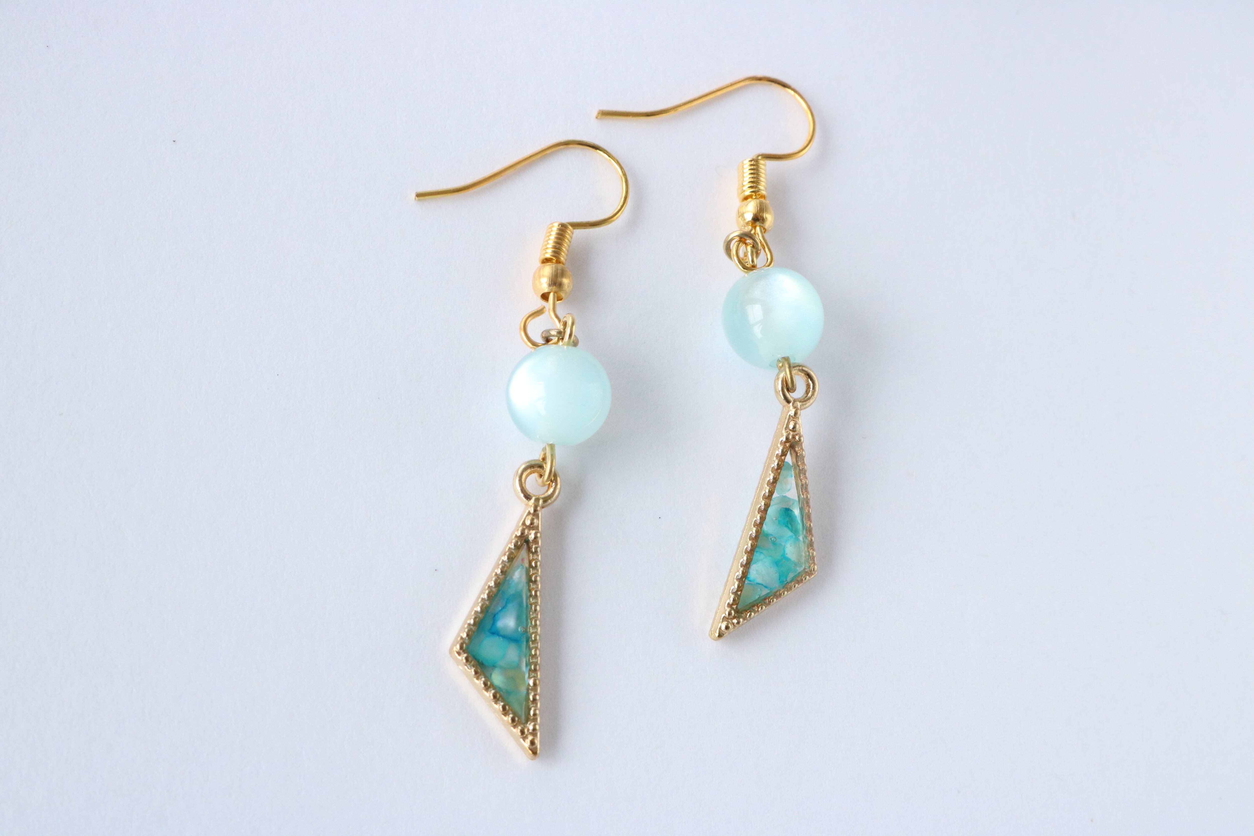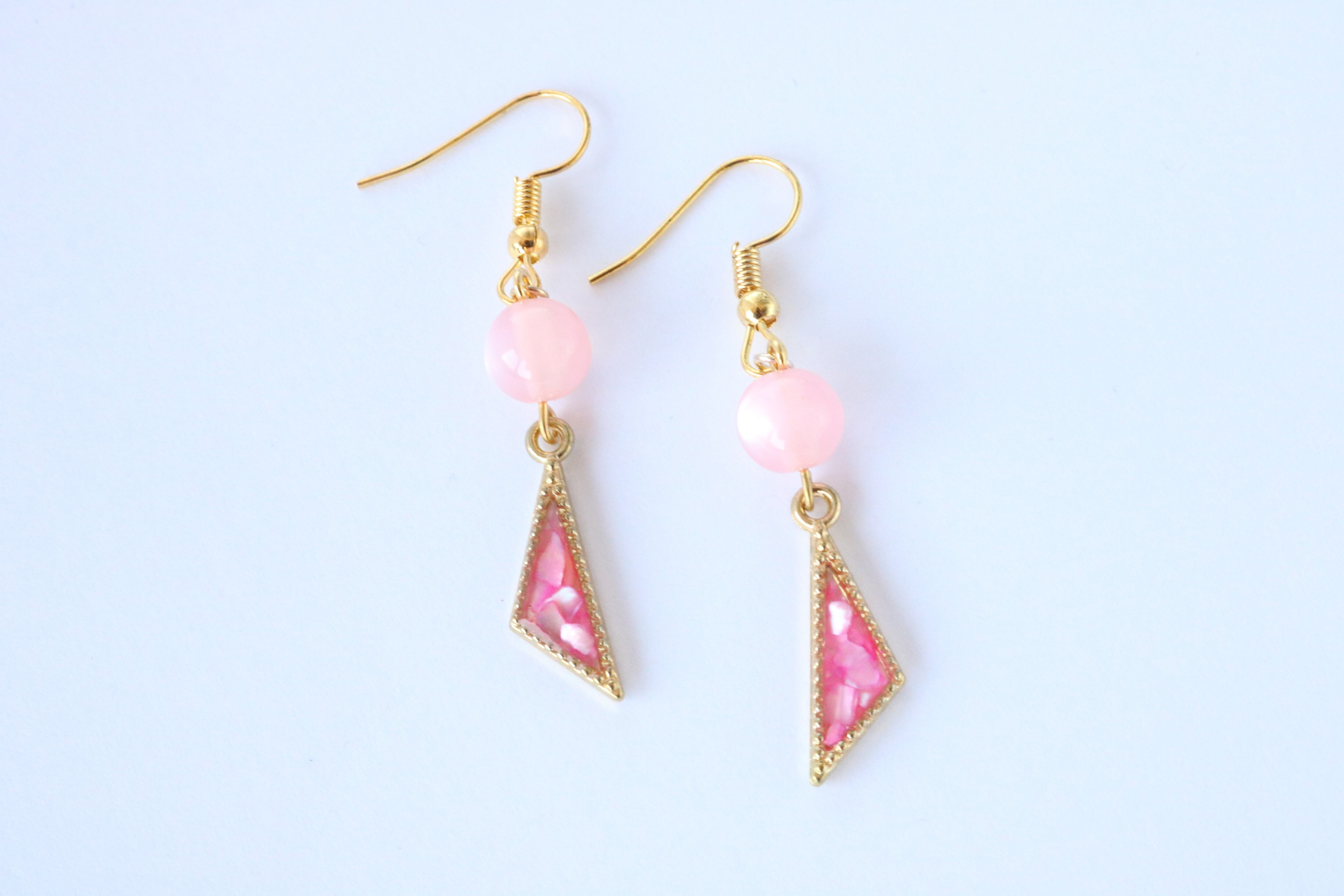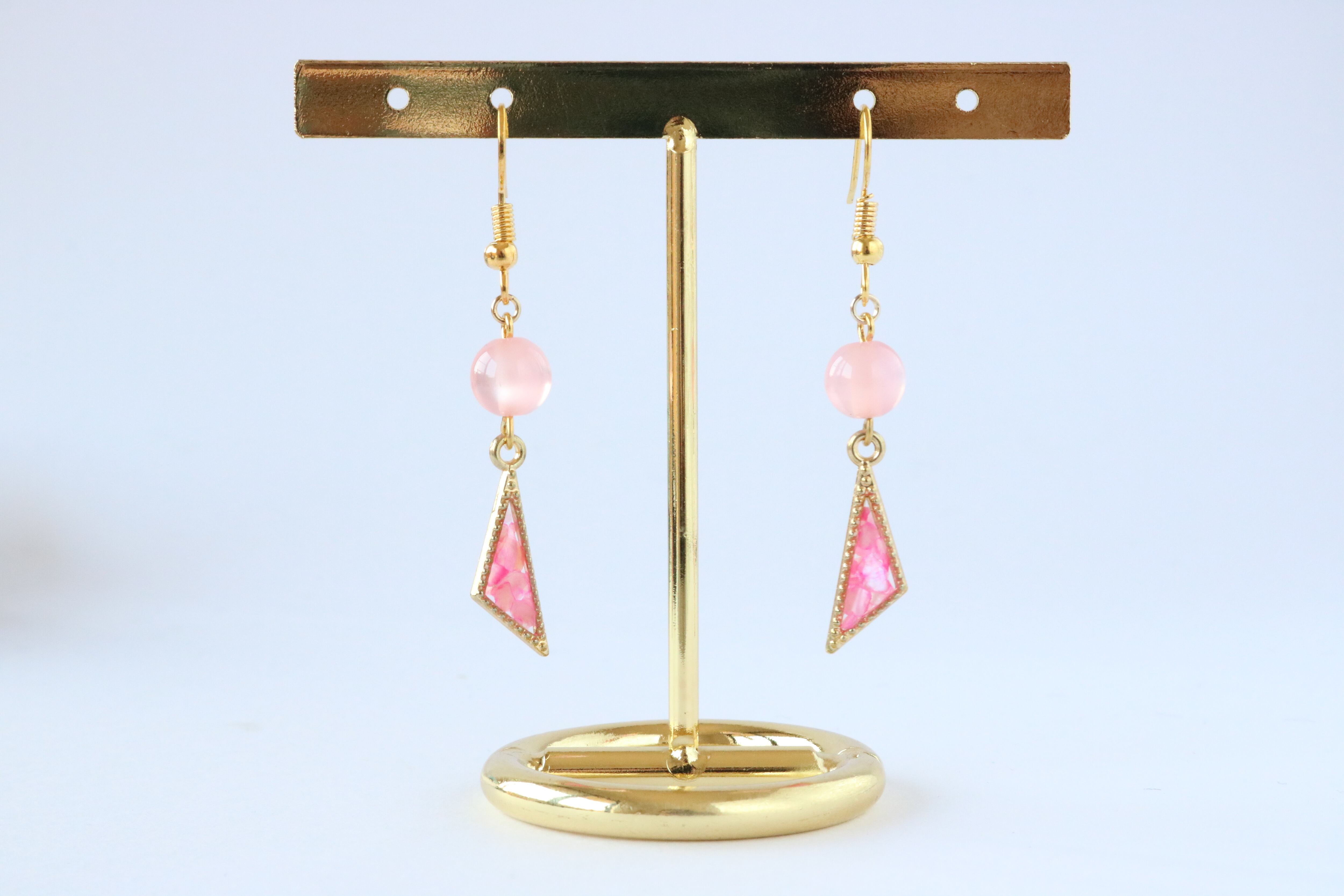 レジンを使用した三角枠チャームに、ビーズやパールがアクセントになった上品でエレガントなゴールドピアスです。♪:*°