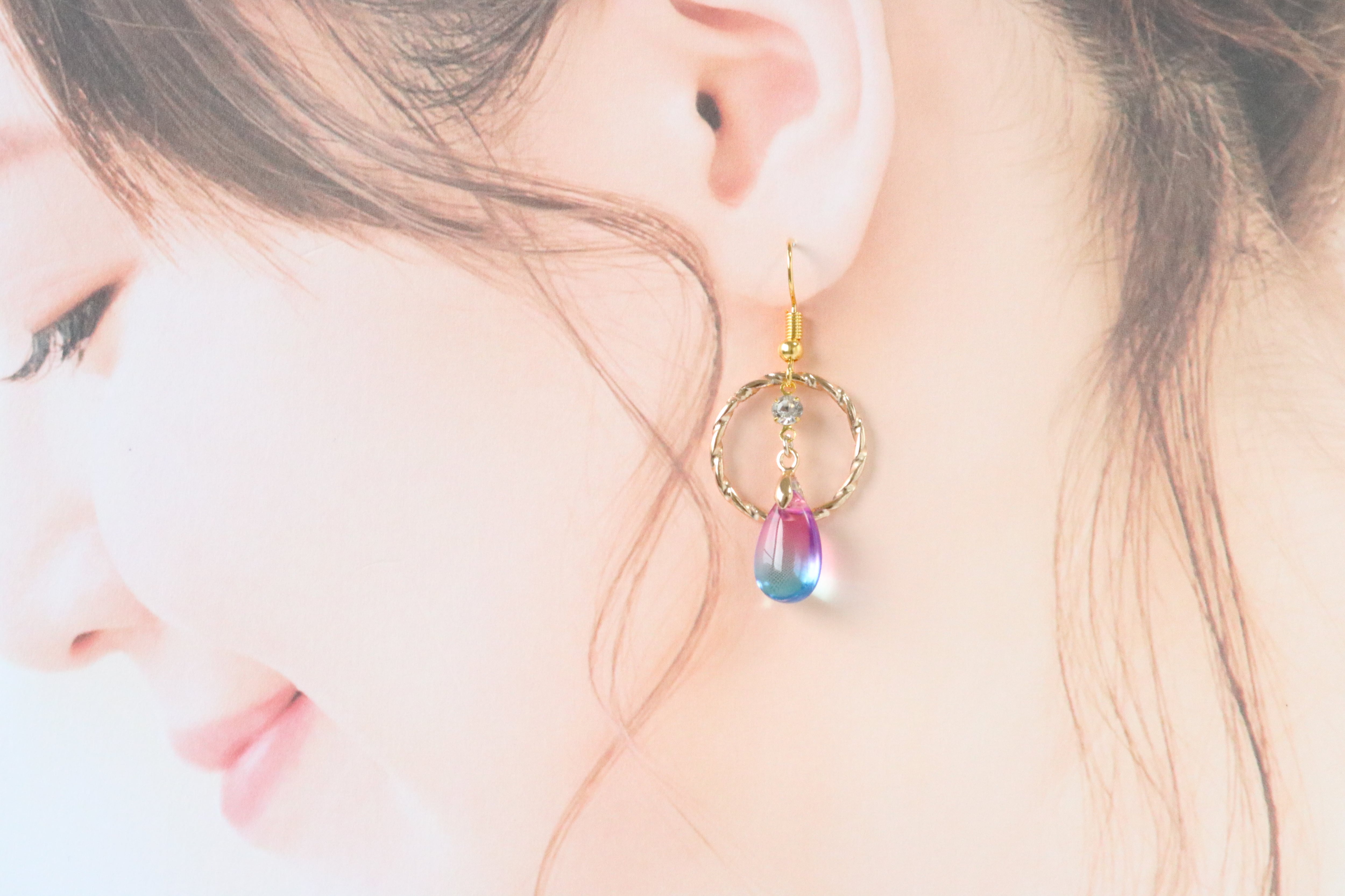 透明感のあるカラーのしずく形ガラスビーズと、華やかなゴールドリングを組み合わせた大人綺麗めゴールドピアスです。♪:*°