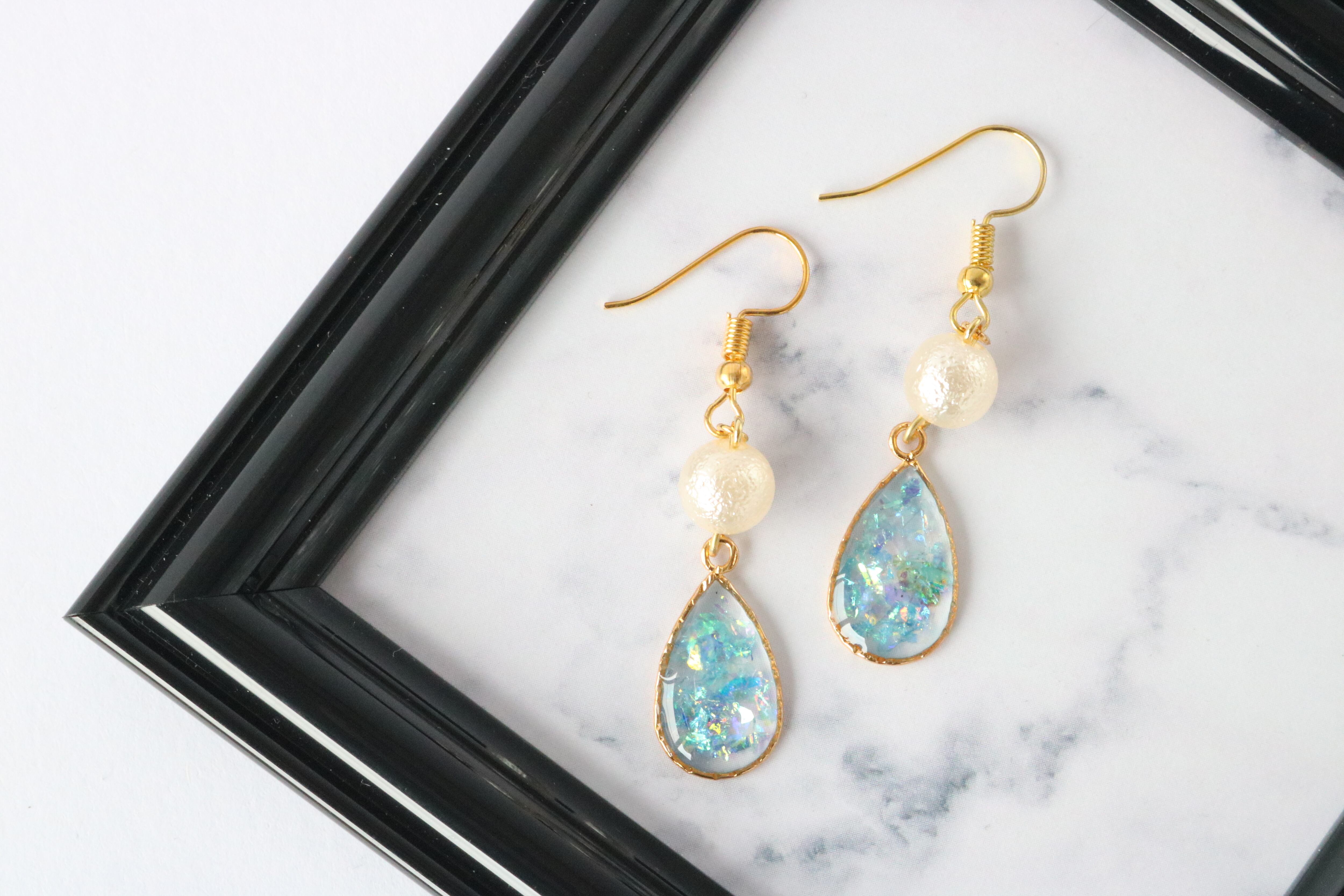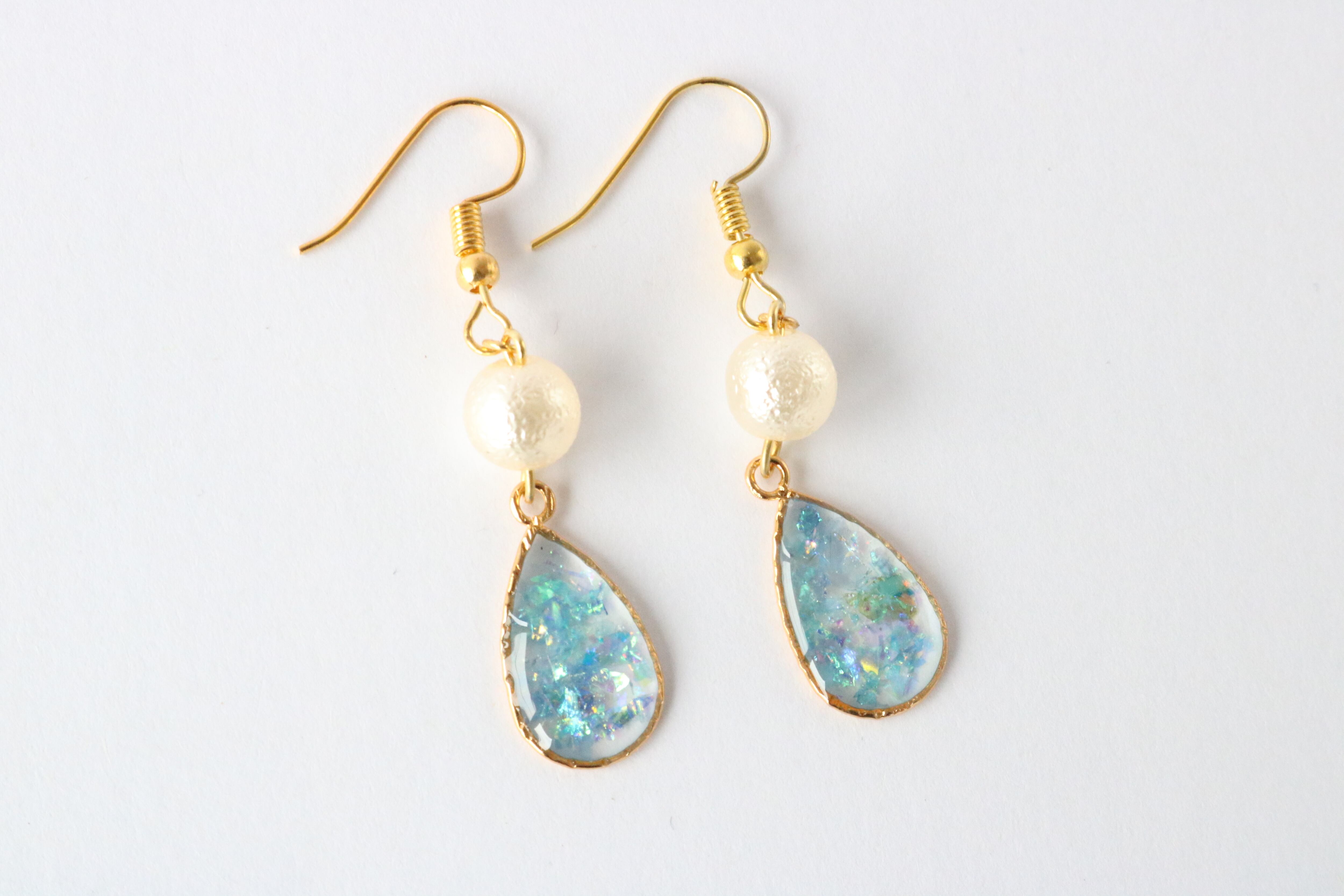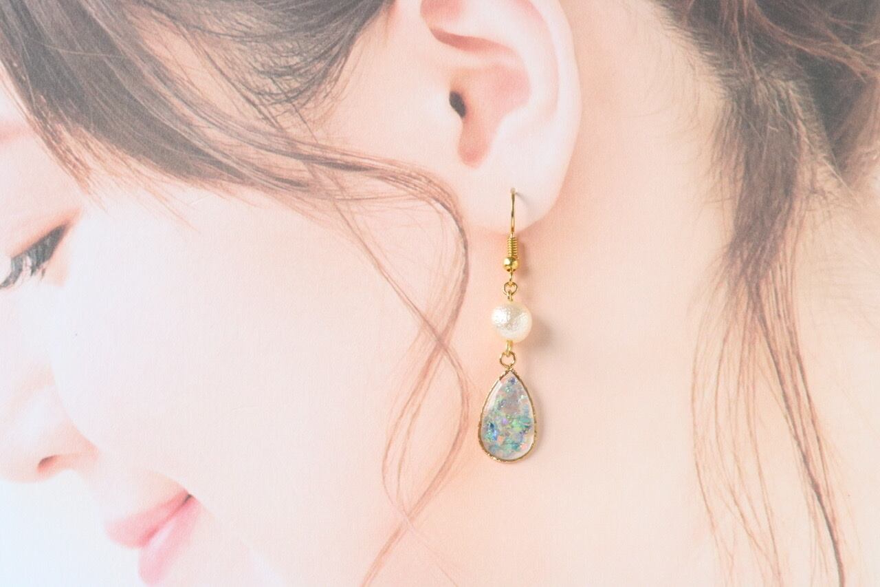 ホワイトのコットンパールに、透明感のあるしずくレジンチャームがアクセントになった大人可愛いゴールドピアスです。♪:*°