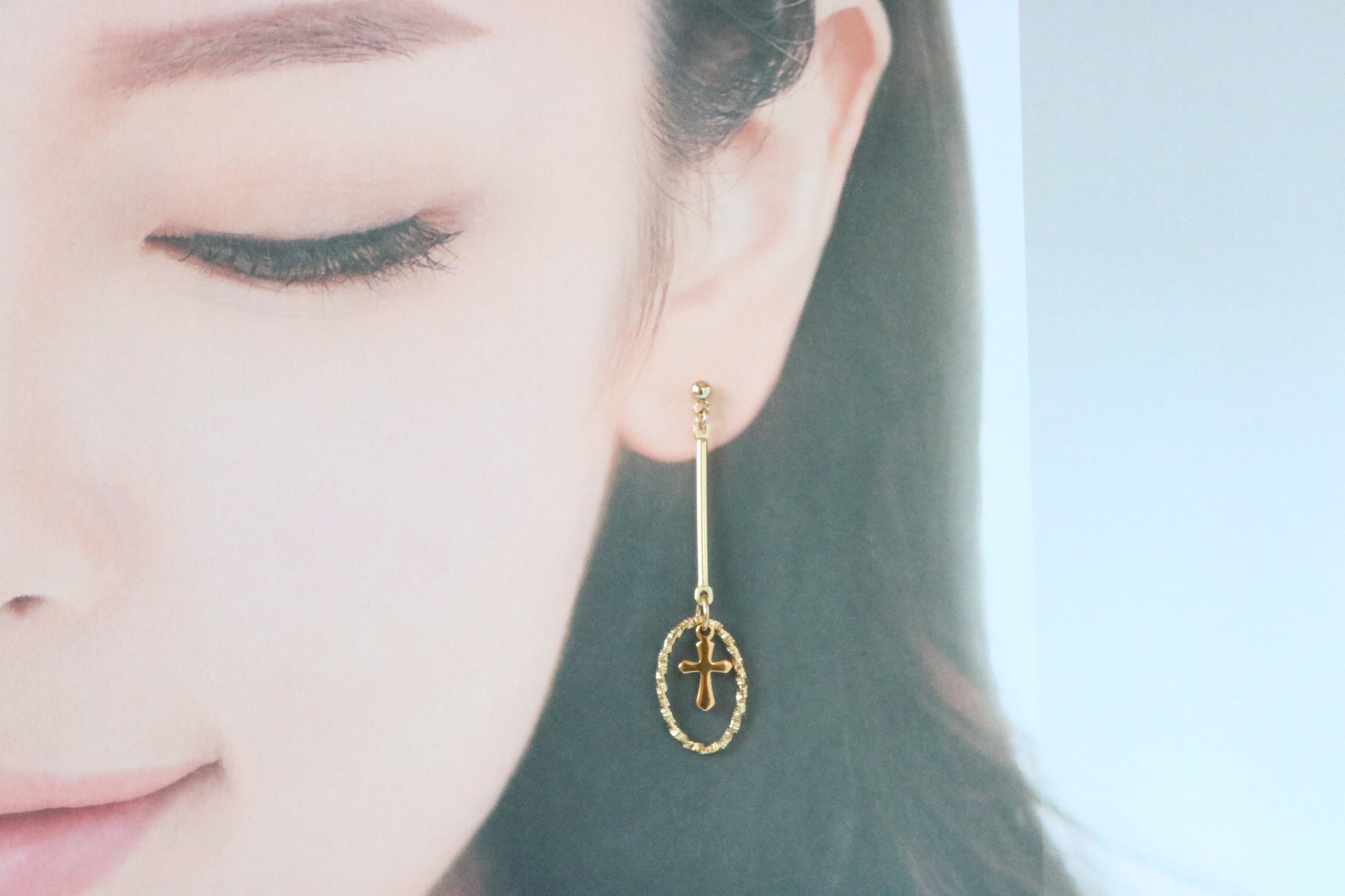 シンプルなゴールドスティックに、ミニクロスとラウンドリングが合わさった綺麗で上品なゴールドピアスです。♪:*°
