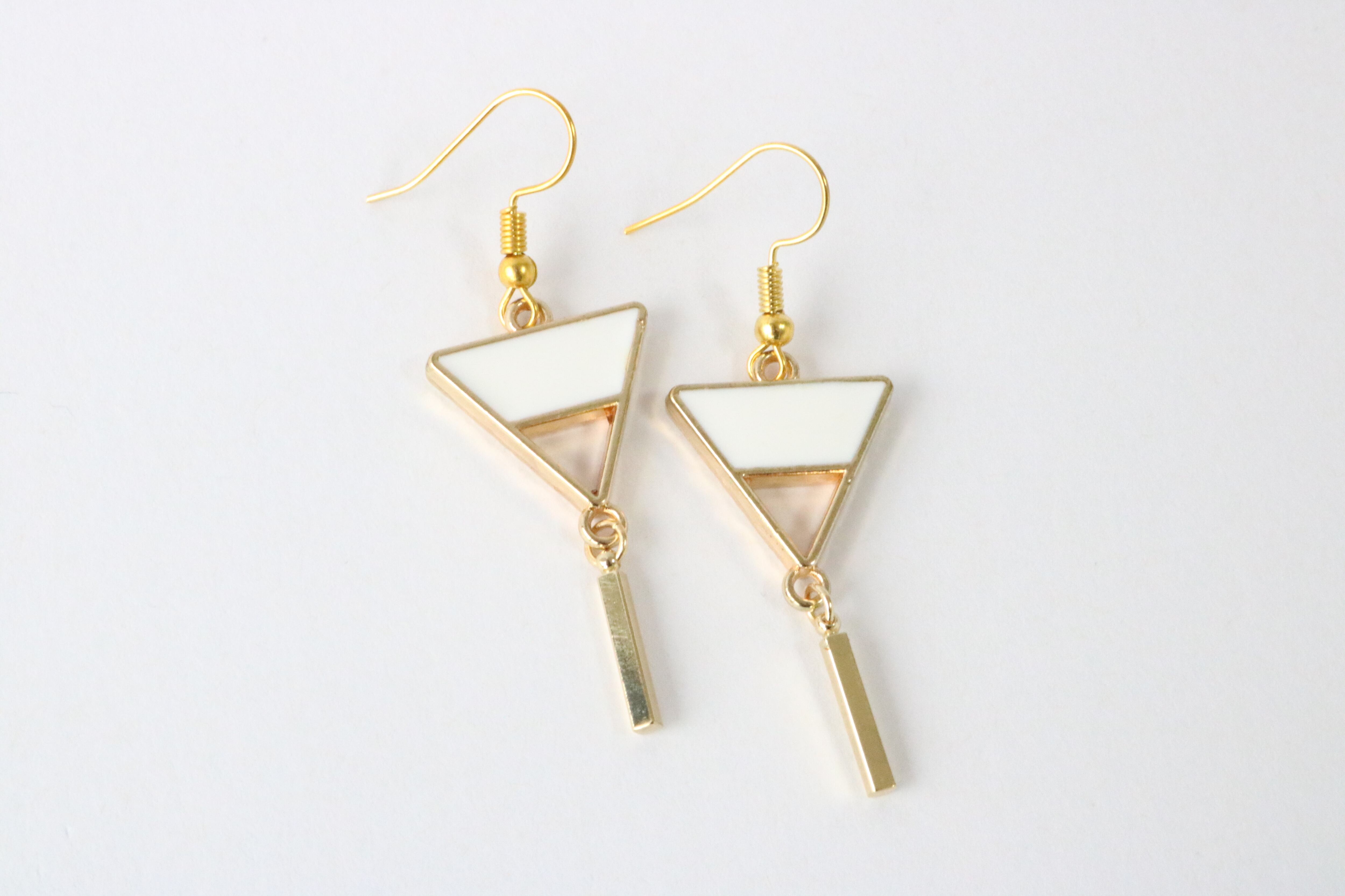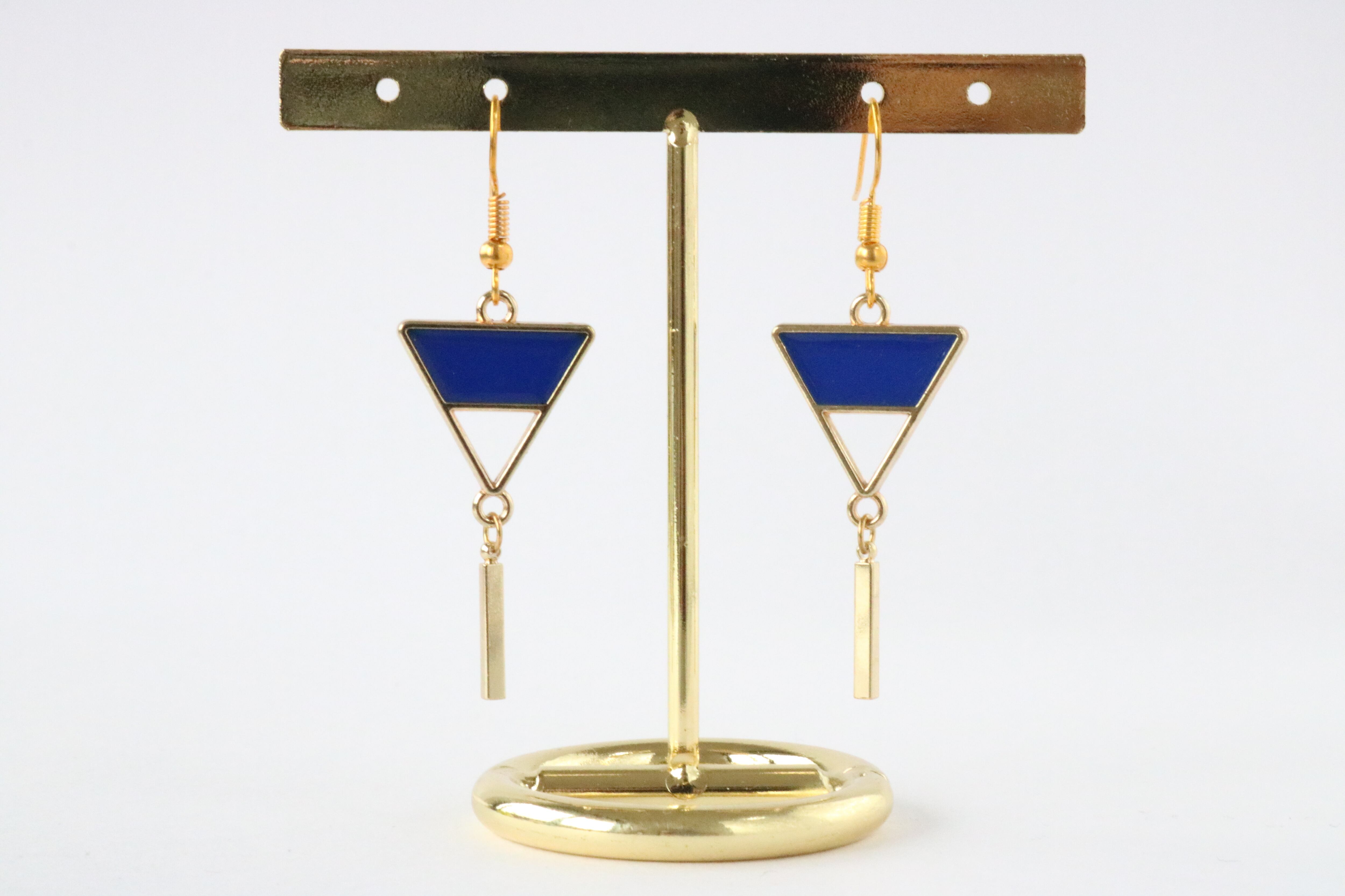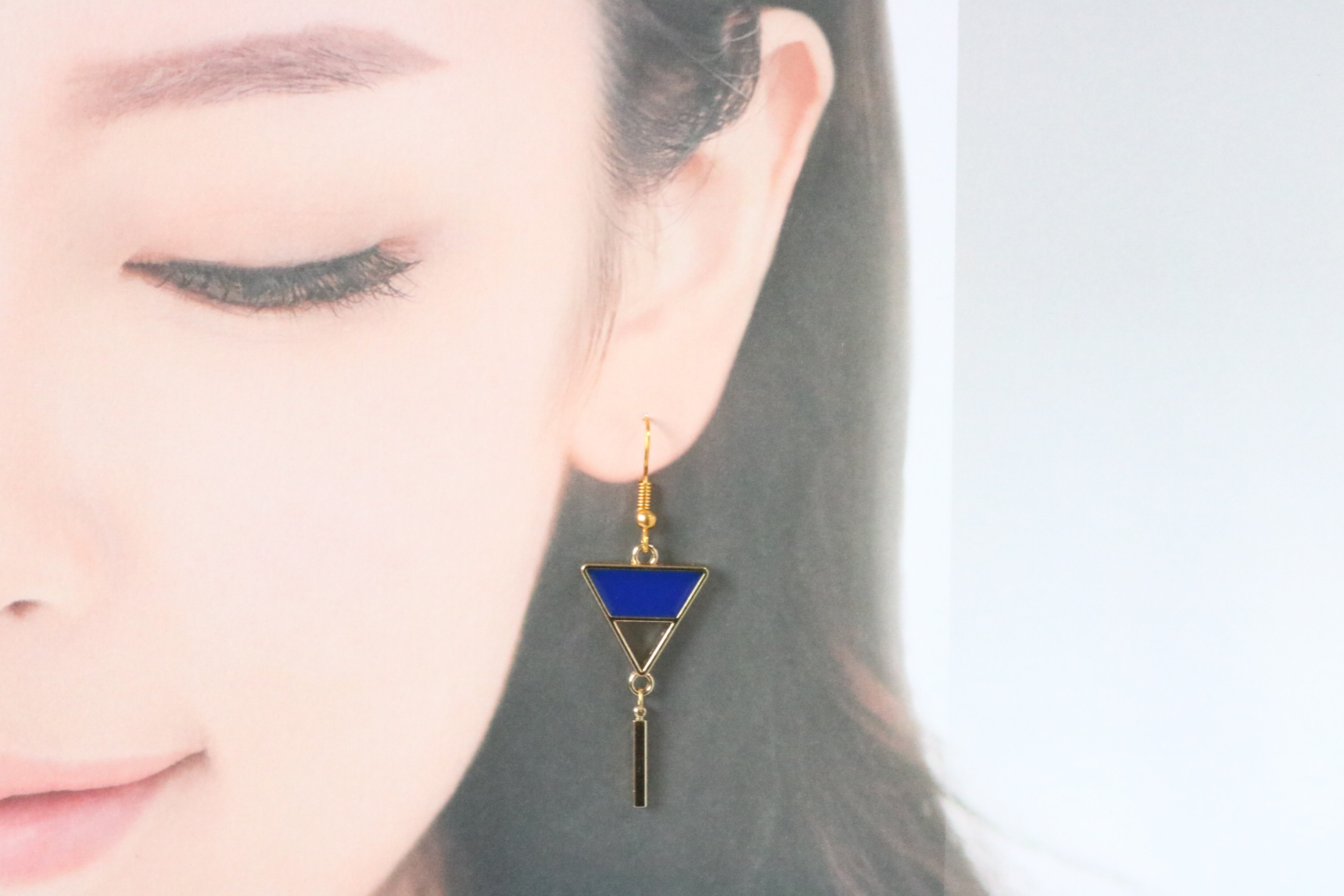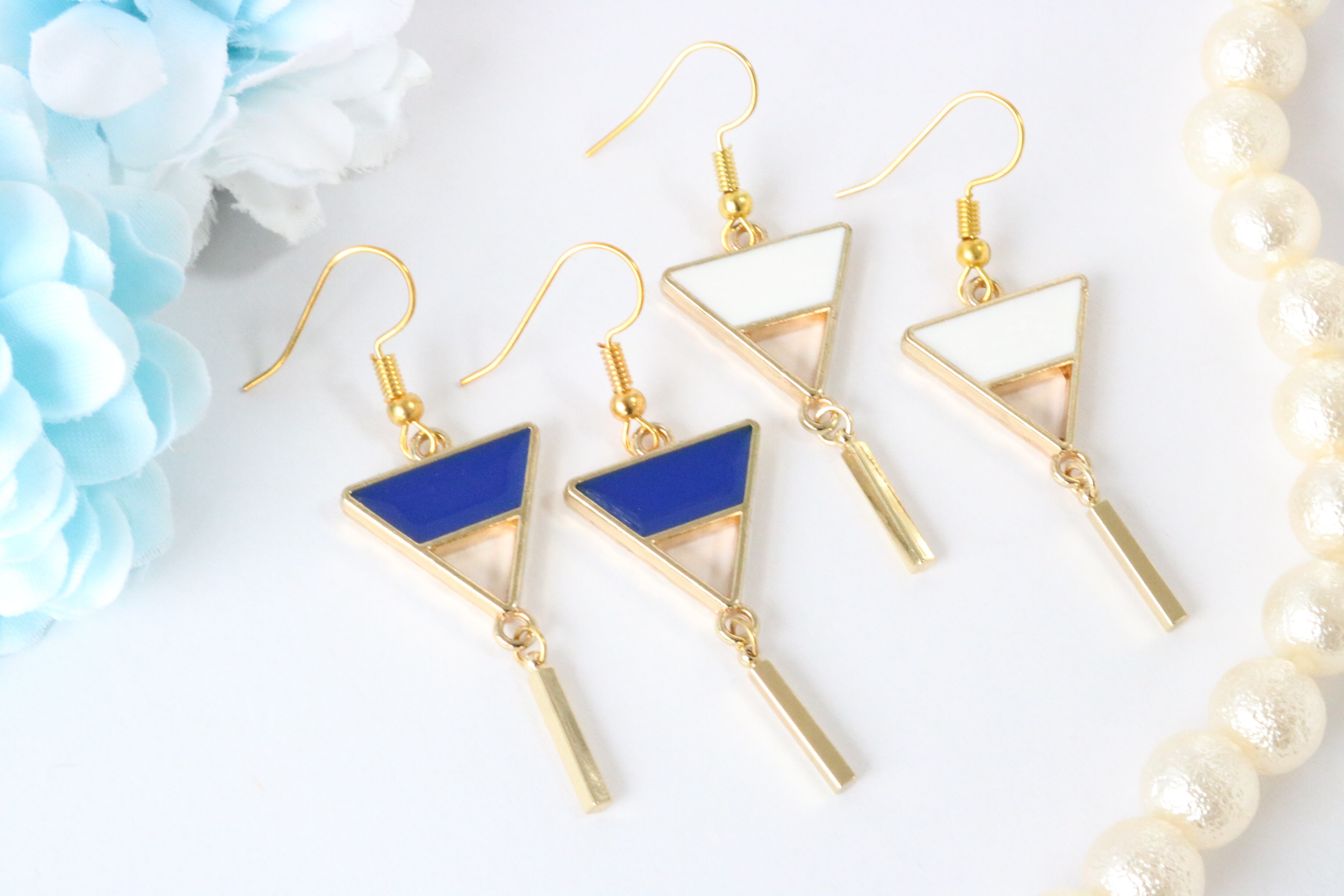 ブルーとホワイトの三角チャームに、メタルスティックがゆらゆら揺れる綺麗で上品なゴールドピアスです。♪:*°