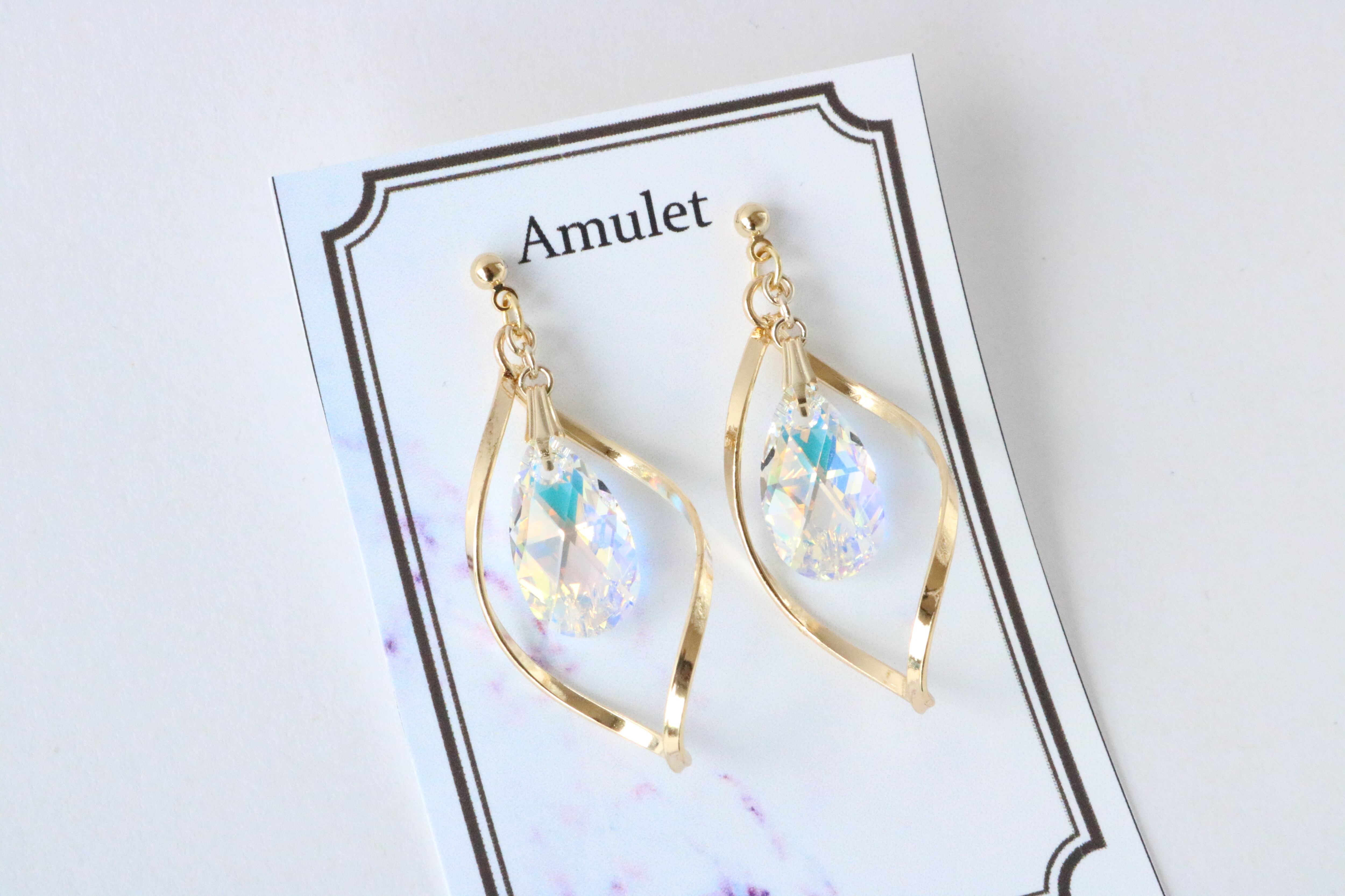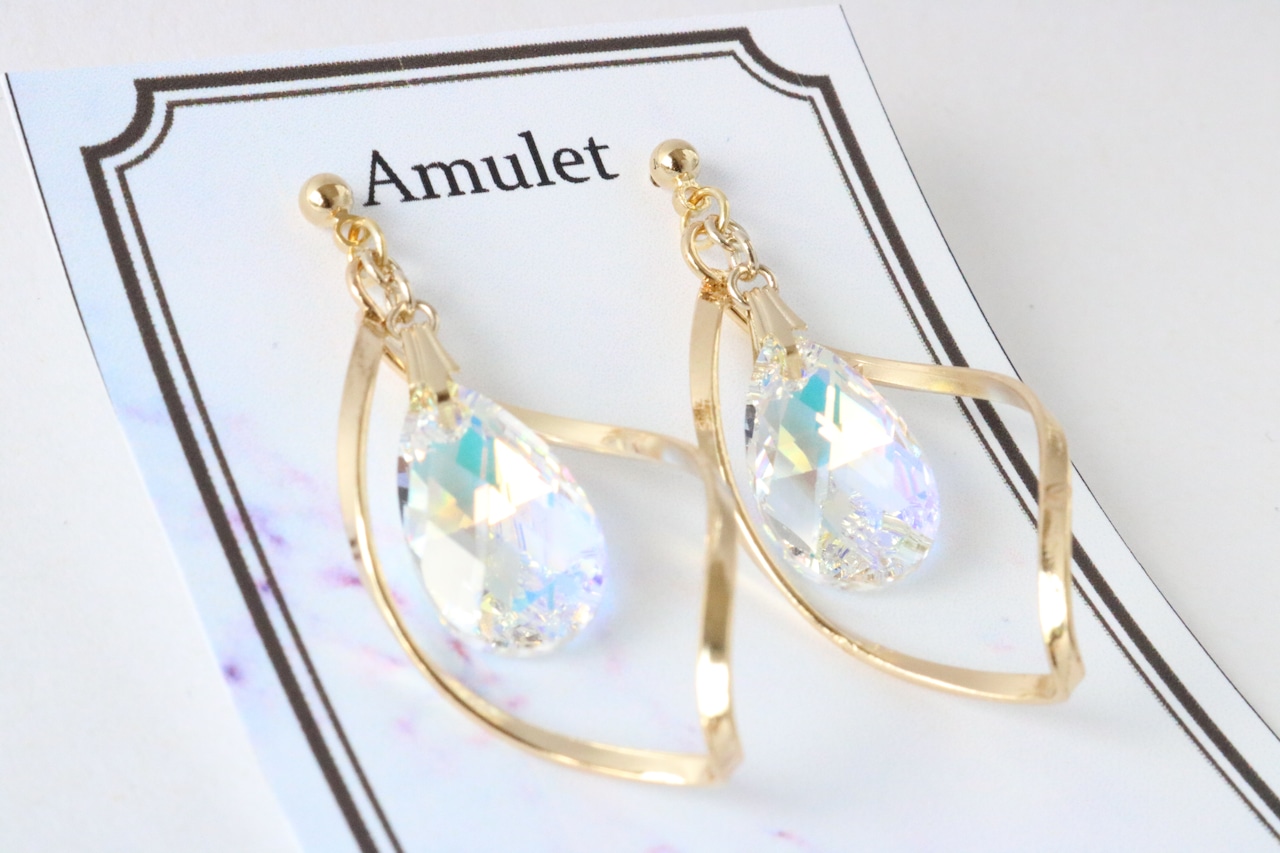 上品なひねりチャームに、高品質なスワロフスキークリスタルを組み合わせ大人綺麗めゴールドピアスです。♪:*°