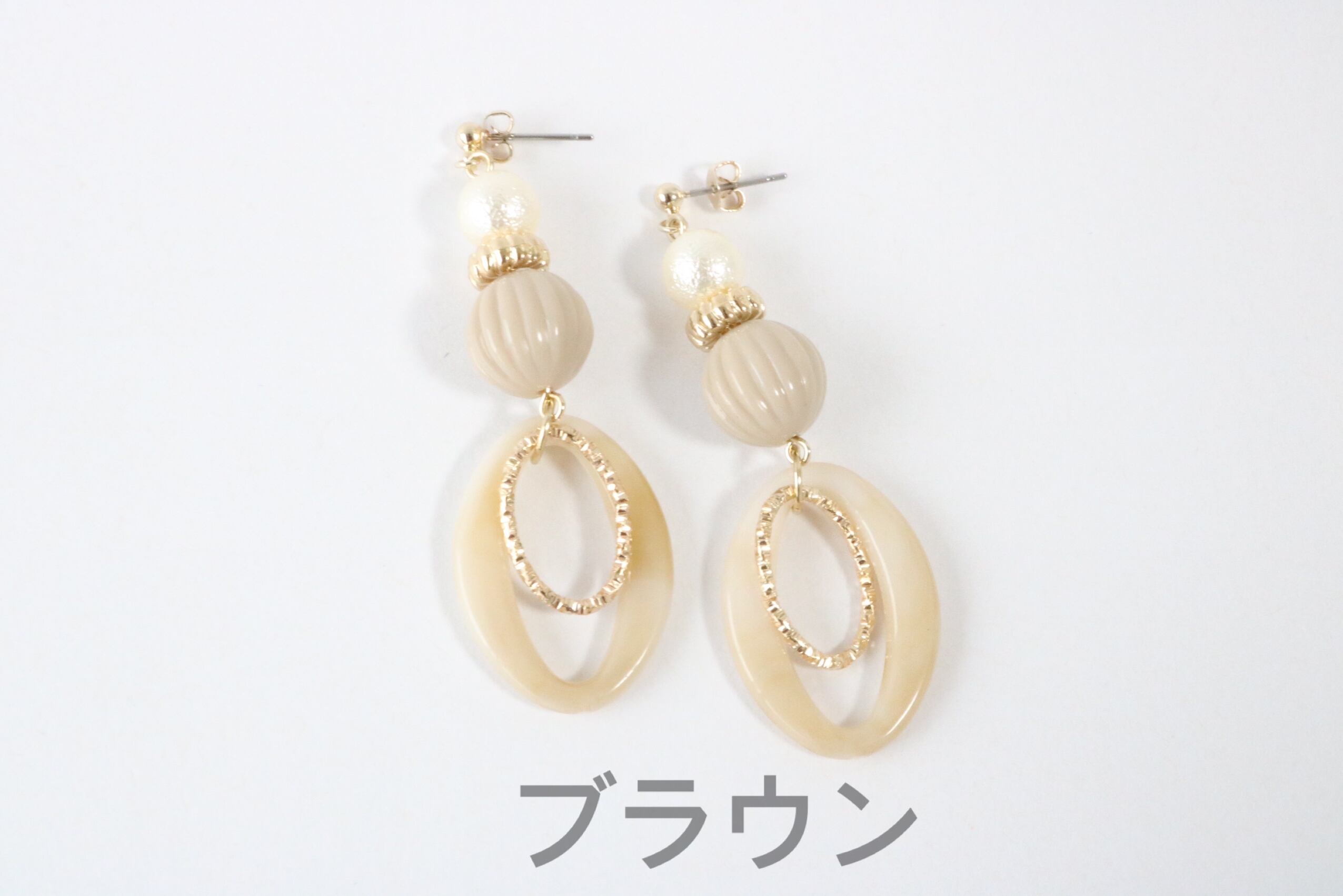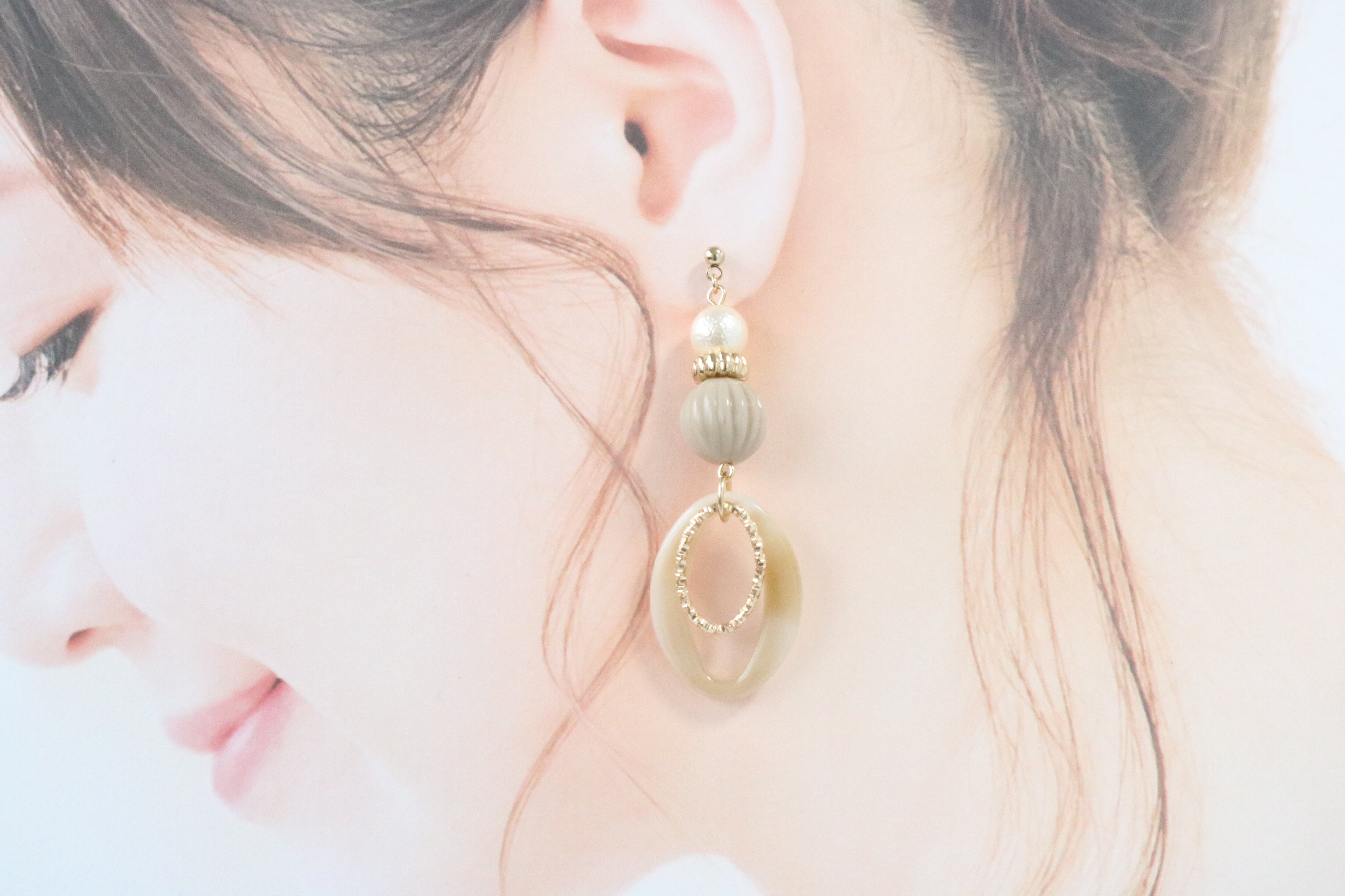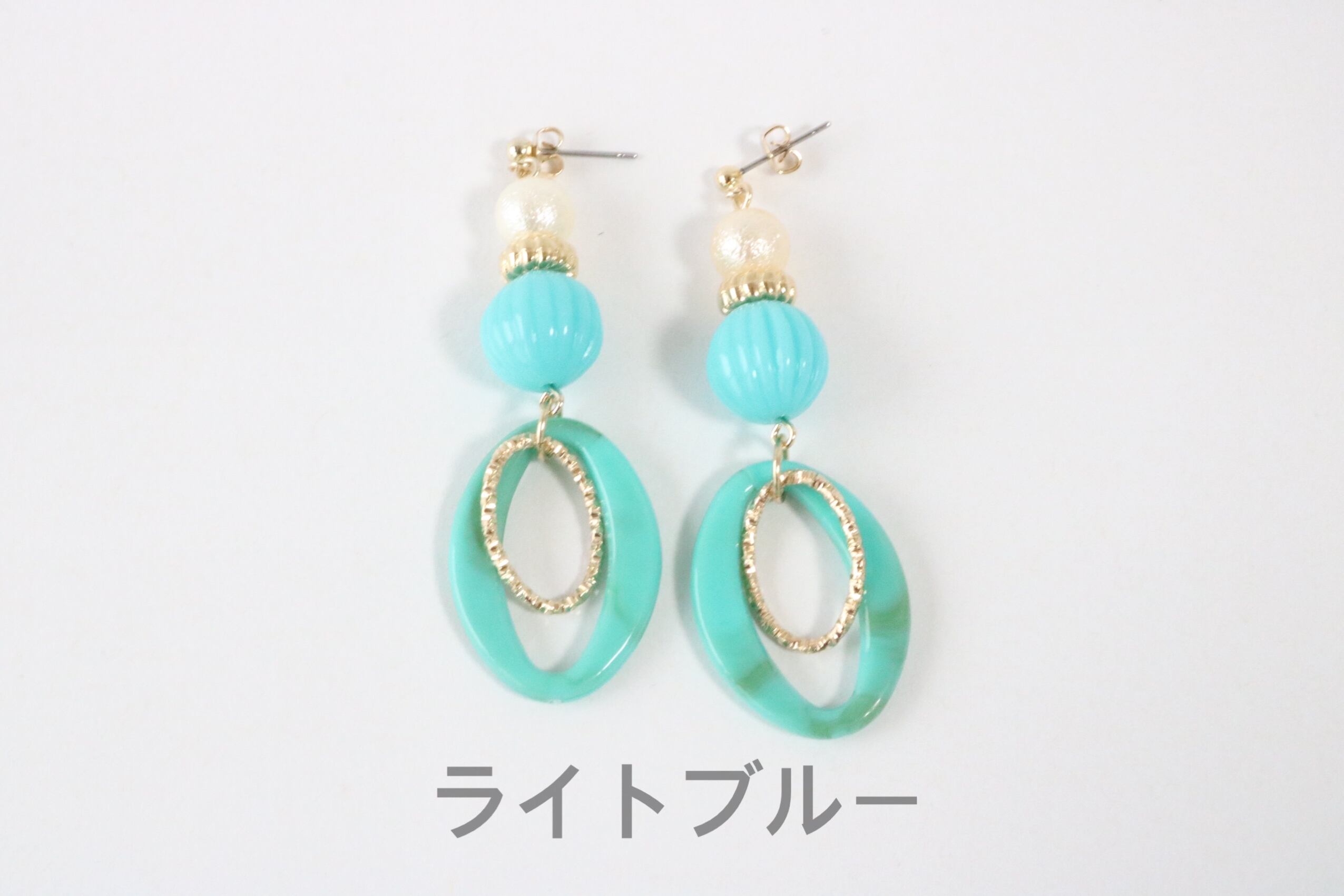 大ぶりのアクリルチャームと、ラインの入ったアクリルビーズ&コットンパールが目を引く大人綺麗めなゴールドピアスです。♪:*°
