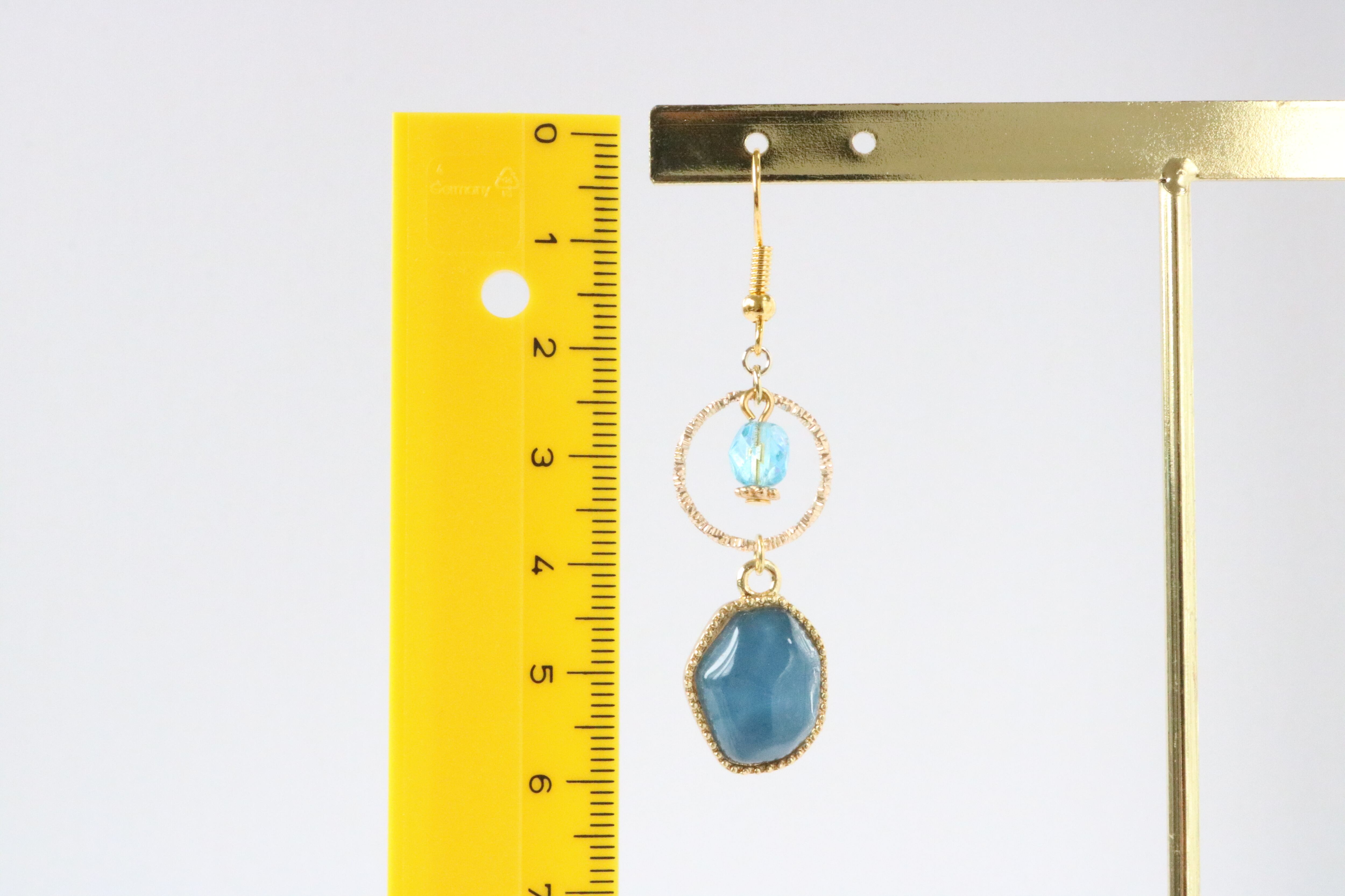 ブルーの透明感あるラウンドパーツに、ゴールドのデザイン丸カンとファイアポリッシュがアクセントになった爽やかなゴールドピアスです。♪:*°