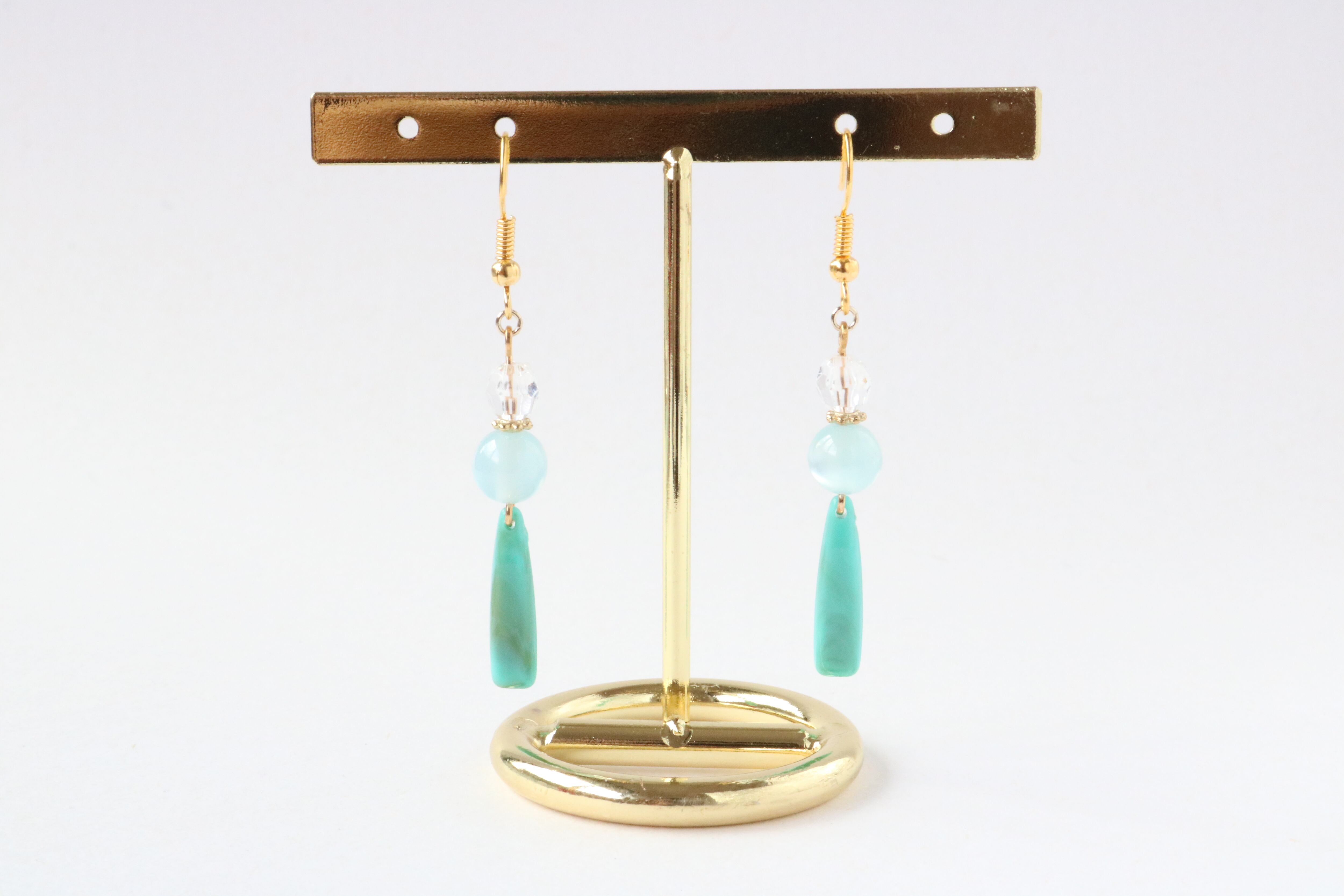 落ち着きのあるアクアビーズと三角アクリルチャームを合わせた大人可愛いゴールドピアスです。♪:*°